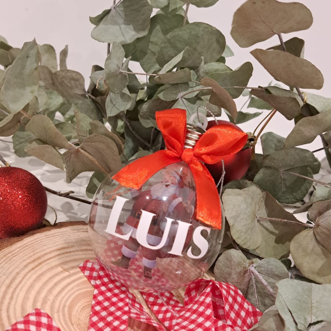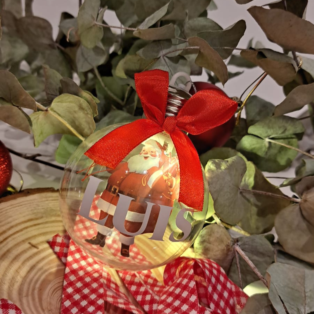 Bola de Navidad personalizada con luz blanca y diseño interior de Papá Noel o Papá Noel con reno. Personalízala con el color y la tipografía que prefieras para hacerla única.