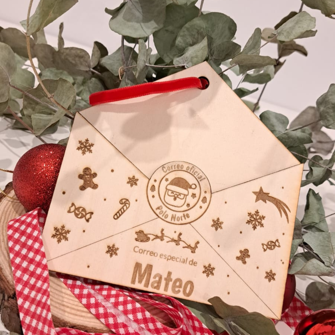 Nuestra carta mágica de Navidad es un detalle lleno de ilusión que encantará a los más pequeños… y también a los que siguen creyendo en la magia. Elaborada en madera de 3 mm, tiene forma de sobre y cuenta con una cuerda de terciopelo que permite colgarla fácilmente en el árbol de Navidad.