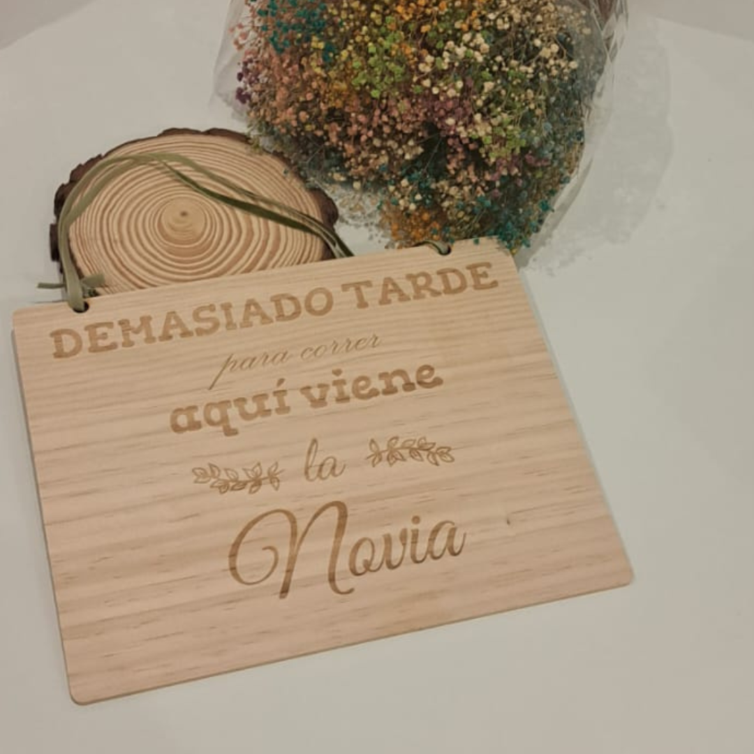 Cartel circular grabado a láser con la frase que elijas. Personaliza el diseño y el color de la cinta para un detalle único y especial.