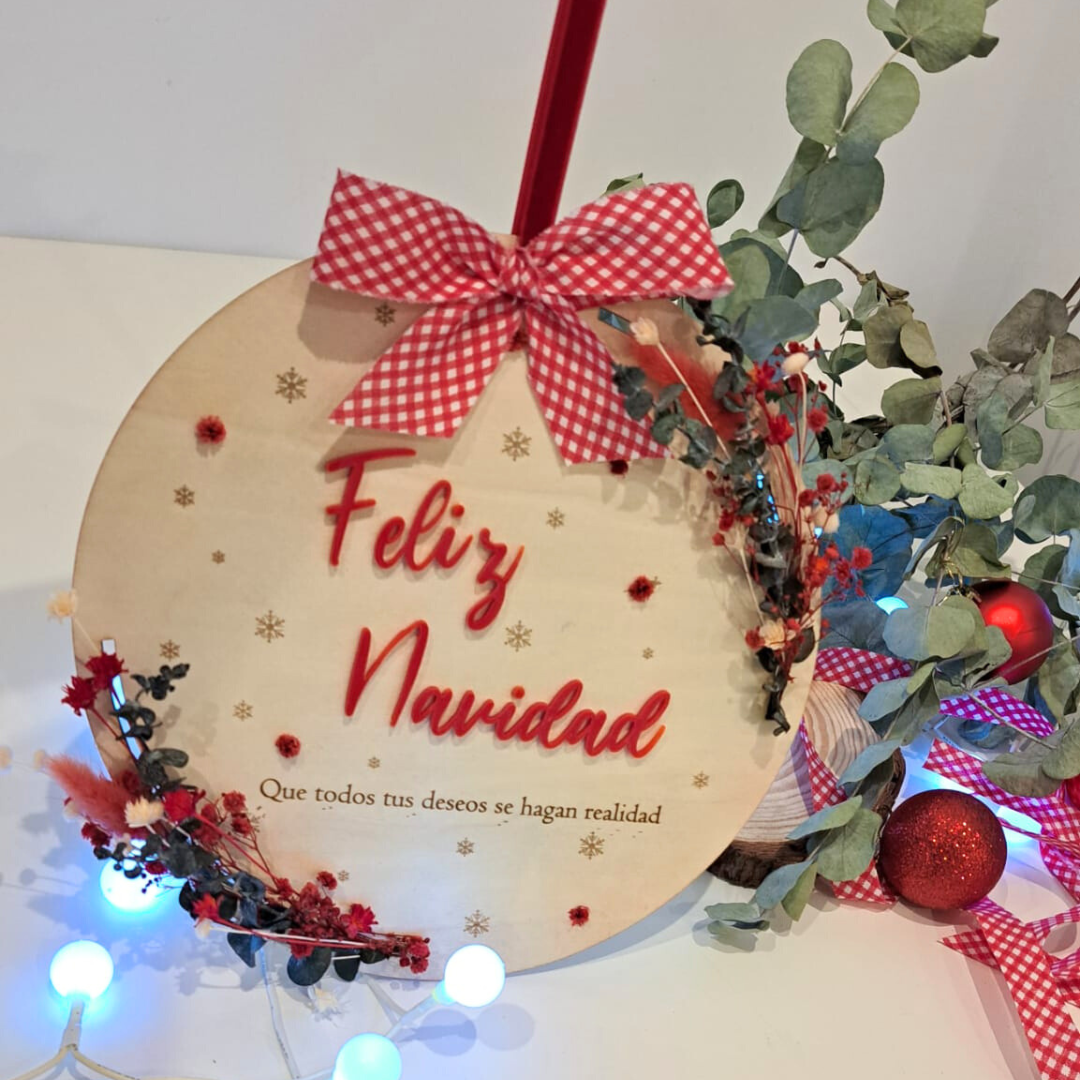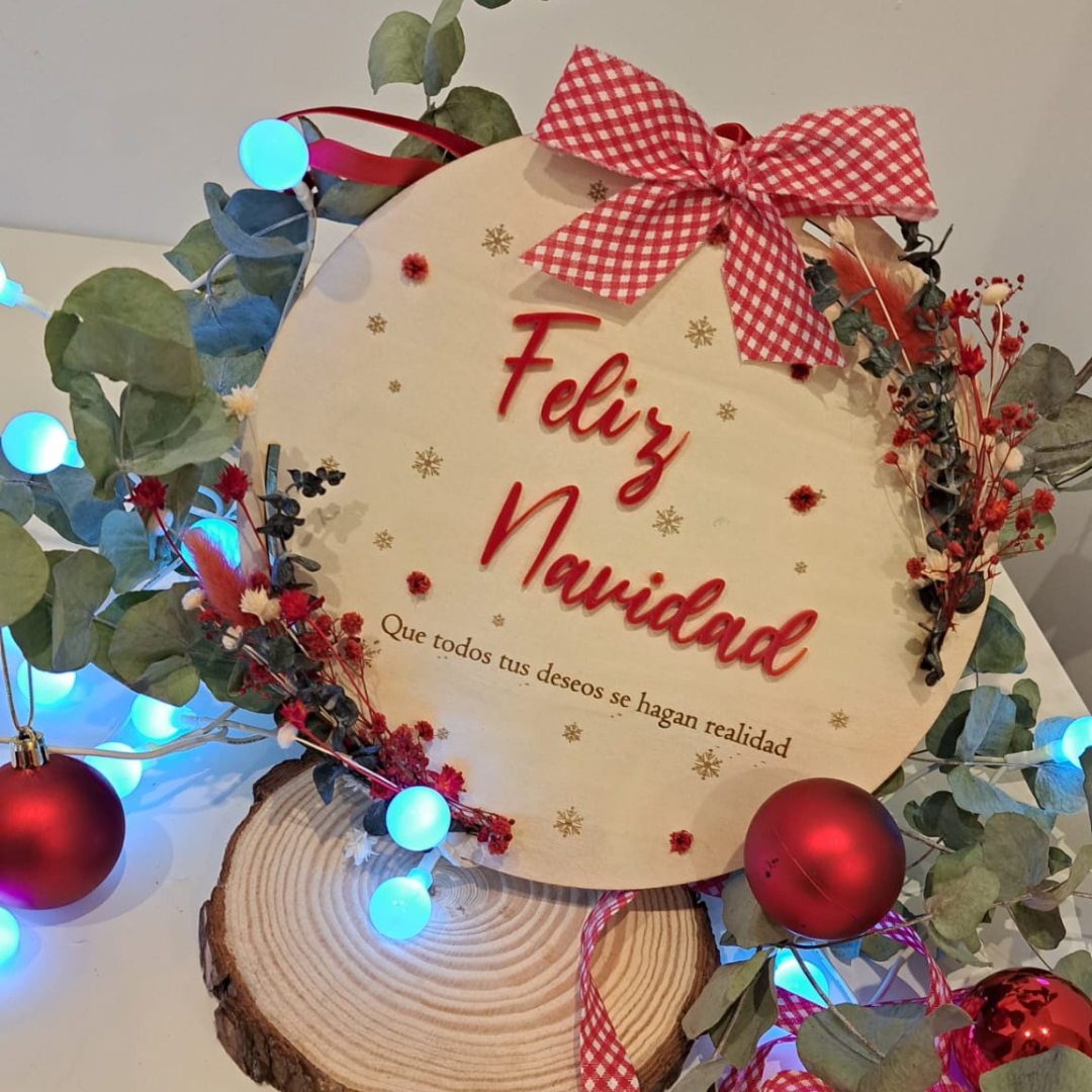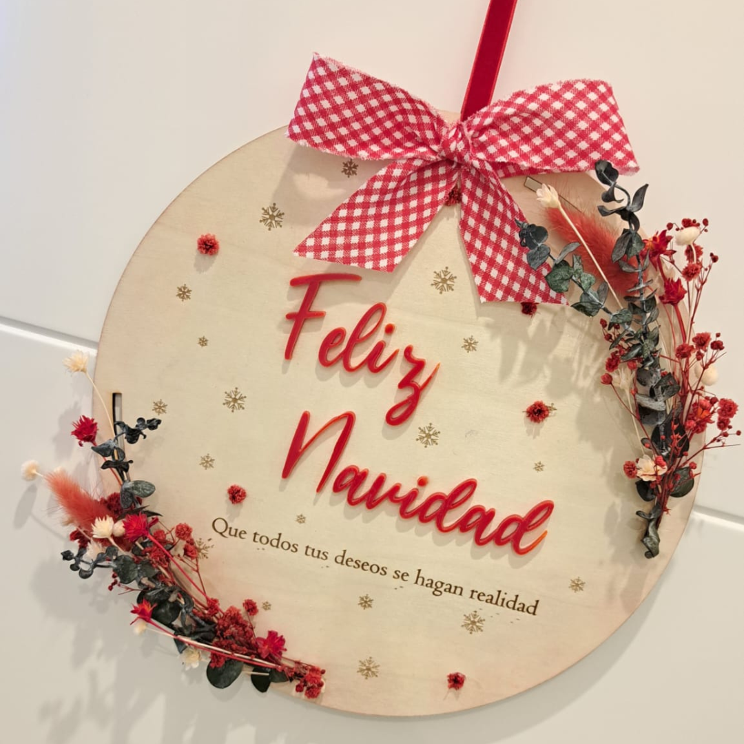 Elaborada sobre una placa de madera natural de 25 cm de diámetro, combina flores preservadas en tonos rojos, blancos y verdes con la frase o palabras principales en metacrilato rojo la cual puedes personalizar , asi como el texto inferior, que va grabado a láser. Se completa con un bonito lazo de cuadros blancos y rojos que le aporta ese aire cálido y festivo típico de la Navidad. Perfecta para colgar en la puerta o en el interior, esta corona es el detalle ideal para felicitar las fiestas de una forma original, natural y con un toque muy especial.