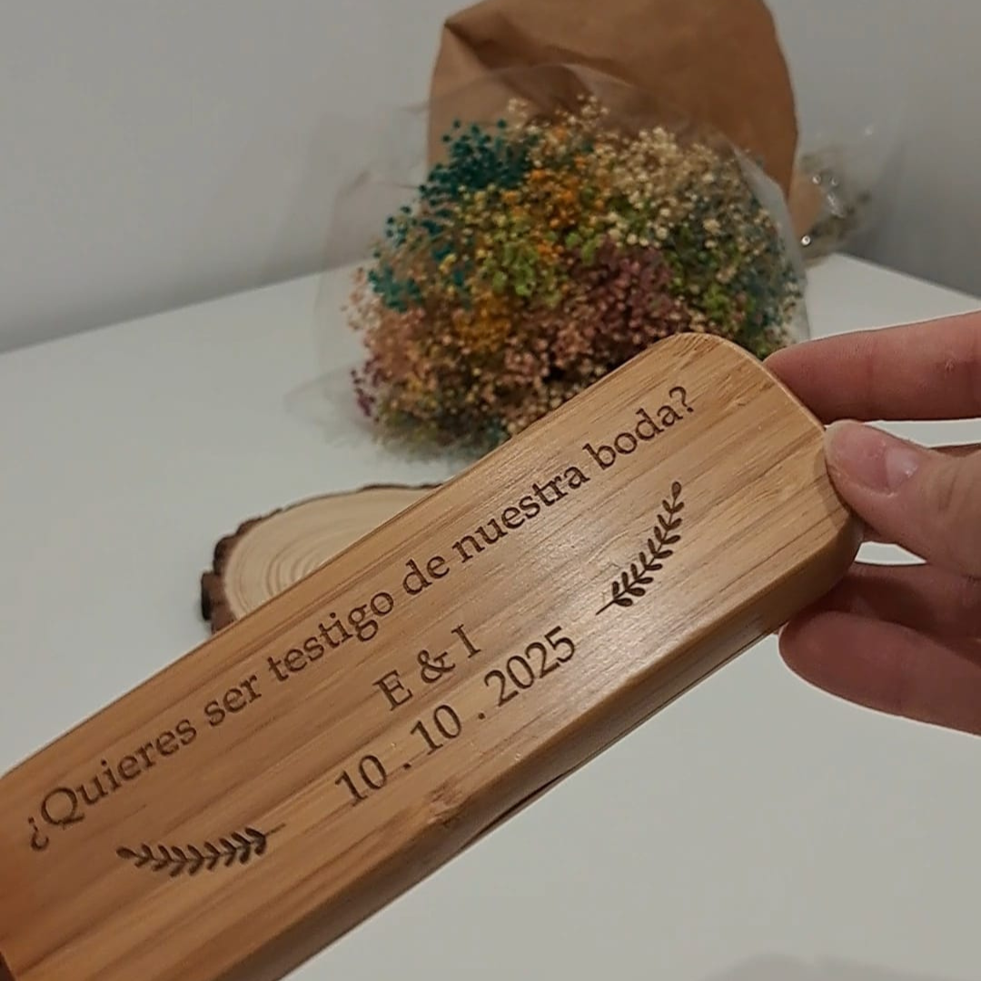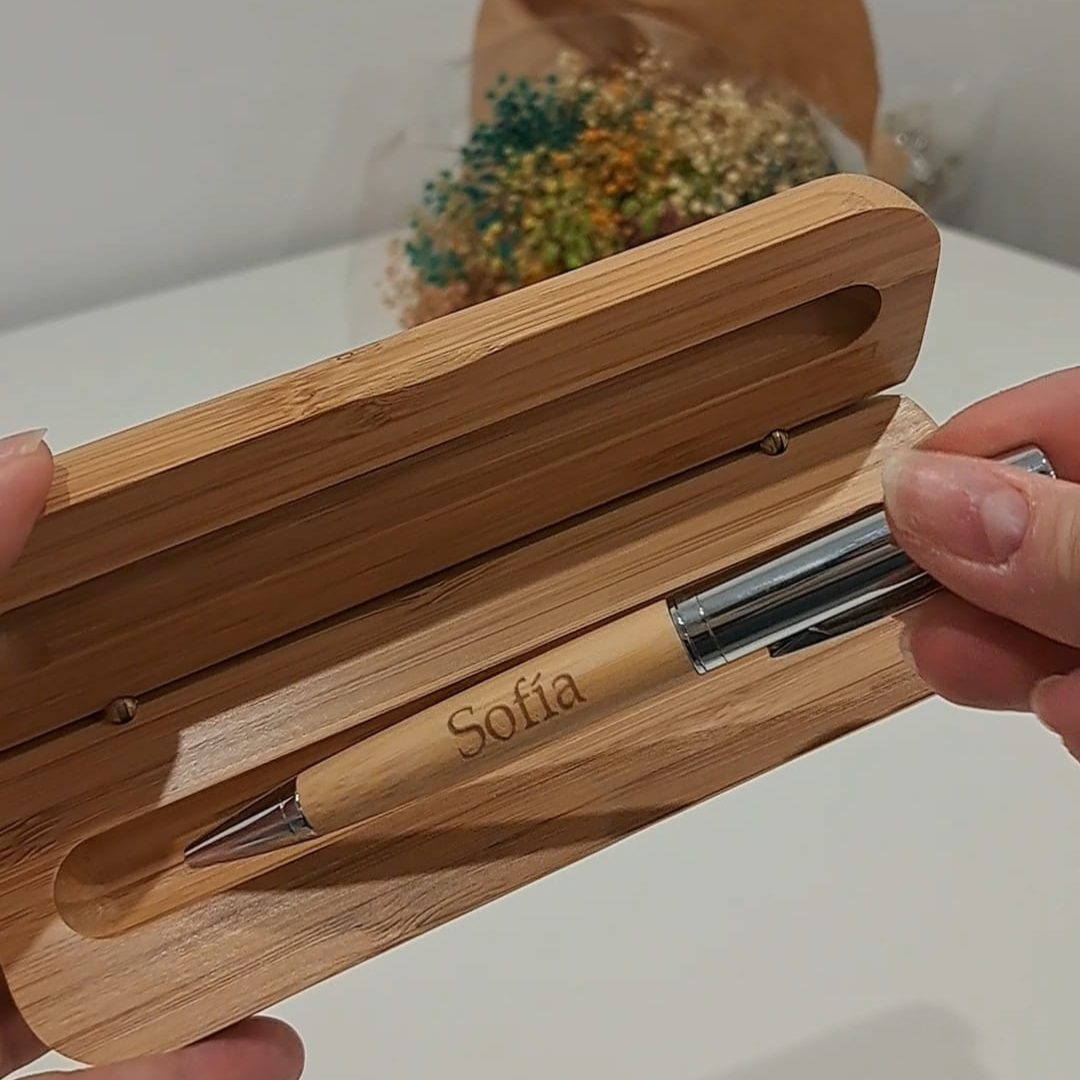 Este bolígrafo con estuche de bambú personalizado es un regalo cuidado y con personalidad, perfecto para quienes valoran los detalles hechos a medida. El estuche, elaborado en bambú natural, se graba a láser con la frase o texto que elijas, convirtiendo cada pieza en un recuerdo único.