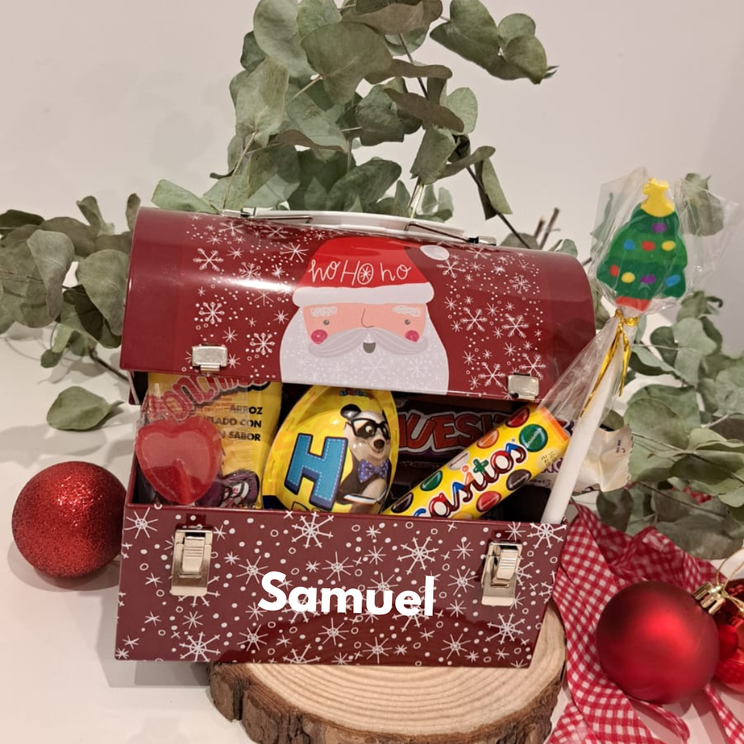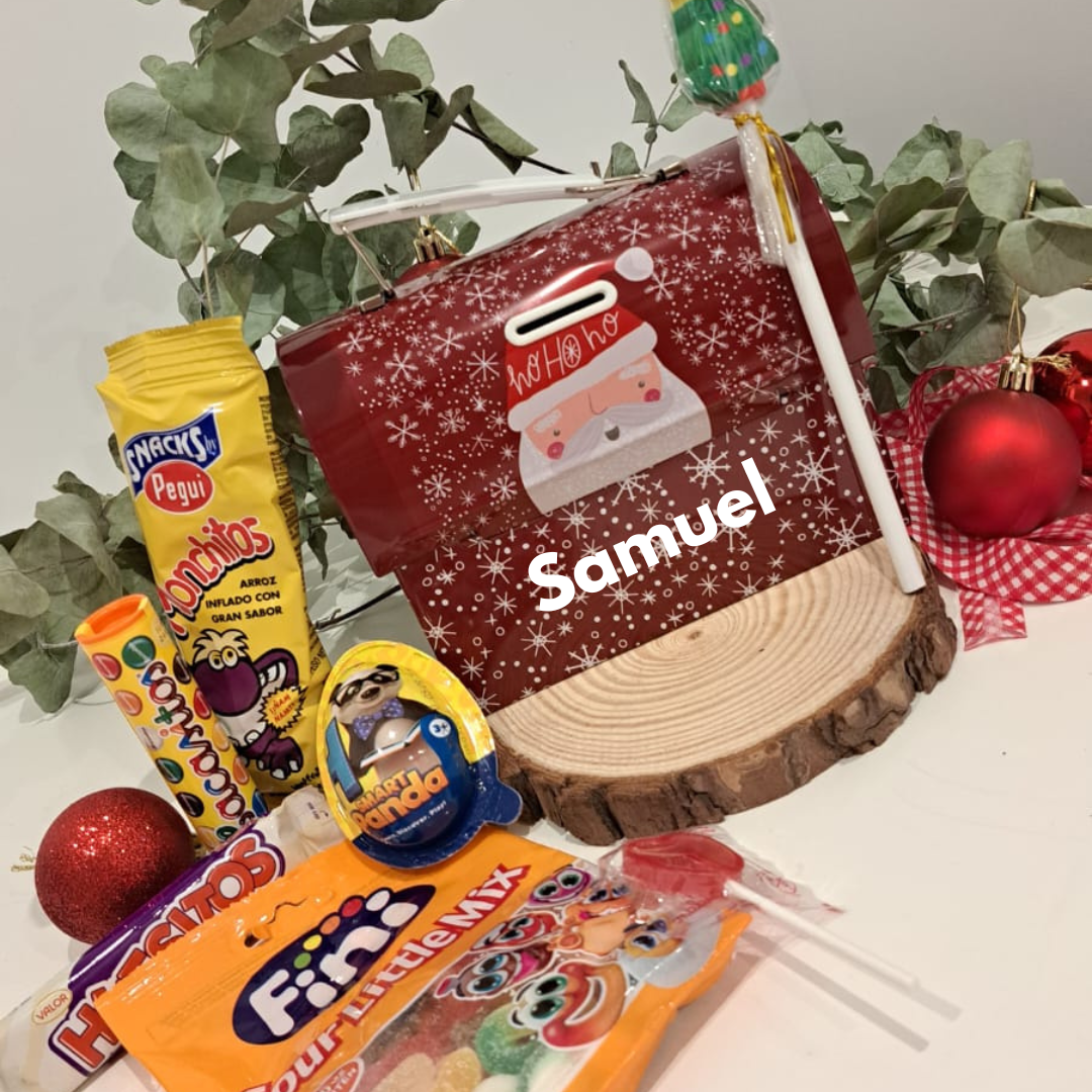 Hucha navideña personalizada con nombre, perfecta para la noche de Papá Noel. Contiene una selección de golosinas y pequeños detalles navideños que endulzarán la velada.