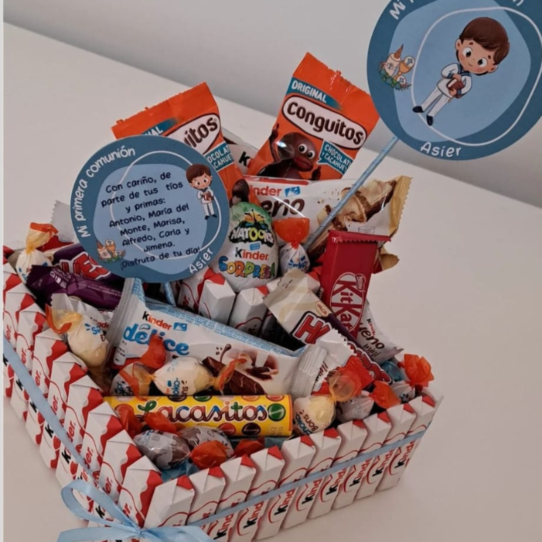 Tarta de chocolatinas de doble piso elaborada con primeras marcas como Kinder, Nestlé, KitKat y otras irresistibles. El relleno puede variar según la disponibilidad del almacén, pero siempre incluye una selección cuidada para disfrutar al máximo. Su diseño de dos alturas la convierte en un regalo impactante, perfecto para cumpleaños, aniversarios, celebraciones especiales o para sorprender con un detalle único y delicioso.