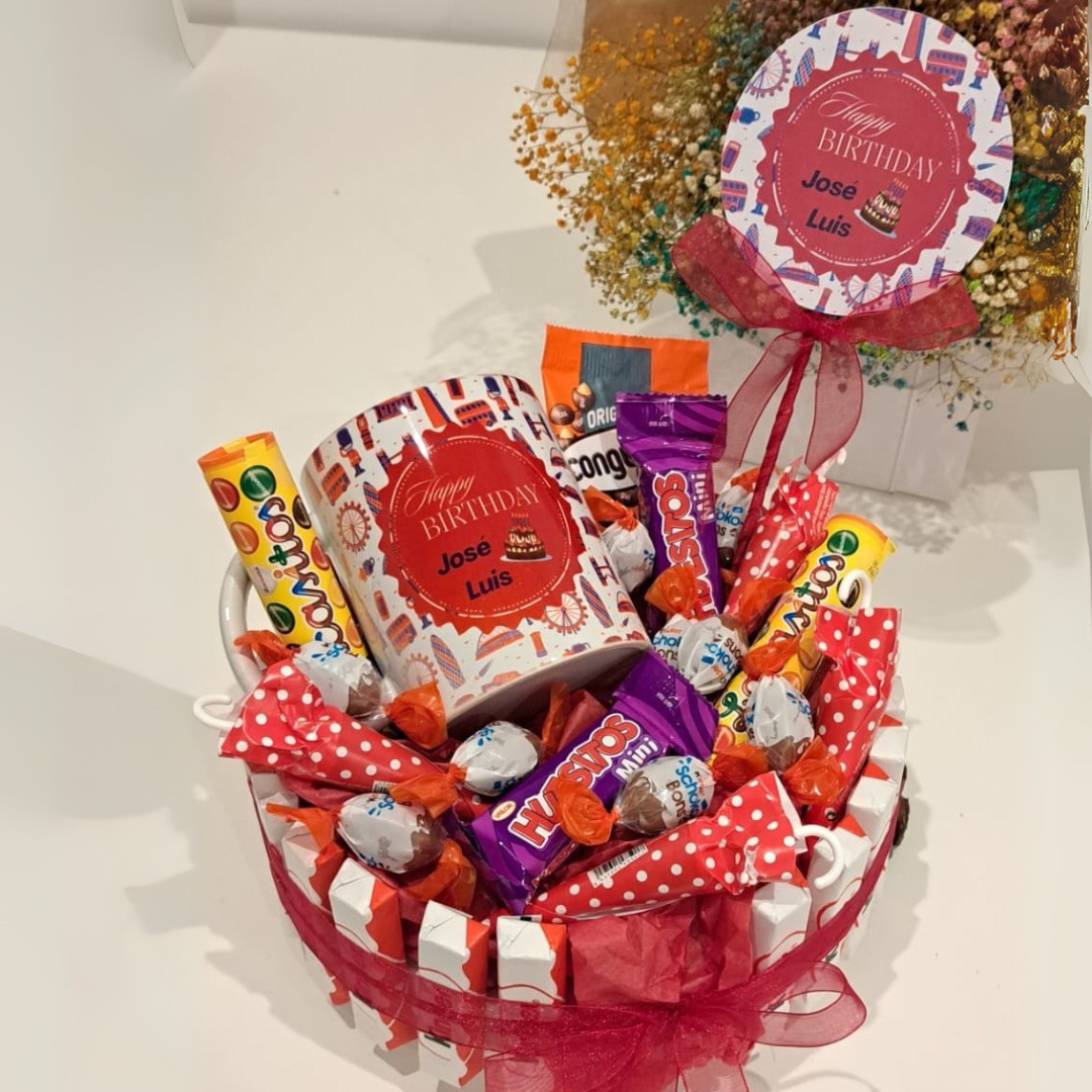 Tarta golosa en un tamaño más reducido, disponible en forma cuadrada o redonda, que combina chocolatinas de primeras marcas como Kinder, Nestlé, KitKat y muchas más. Incluye además una taza personalizada para darle un toque único al detalle. El relleno puede variar según la disponibilidad del almacén, pero siempre con la mejor selección. Un regalo dulce, original y especial para cumpleaños, aniversarios o cualquier ocasión.