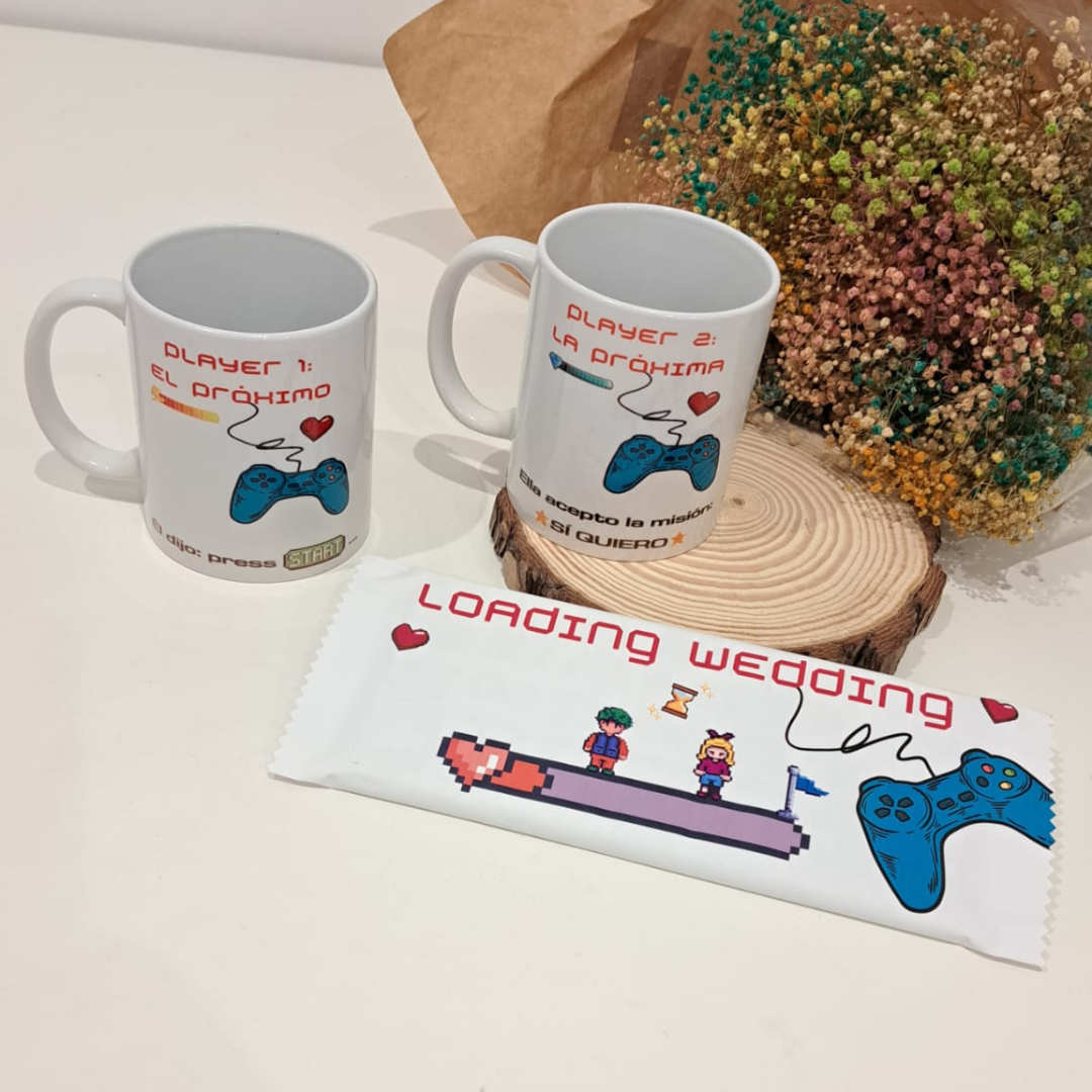 Este pack incluye las tazas y una tableta de chocolate personalizada para endulzar ese bonito momento, un regalito ideal.